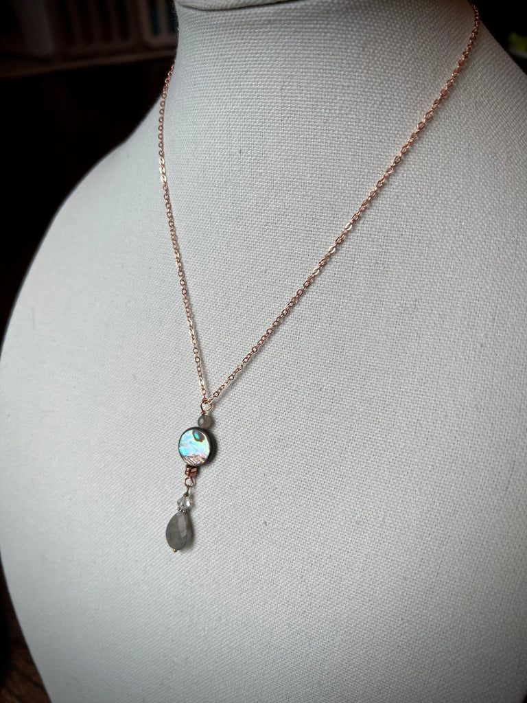 Beautiful shiny rose gold plated copper chain. Abalone Shell W/ 2 Labradorite & Swarovski Crystal.