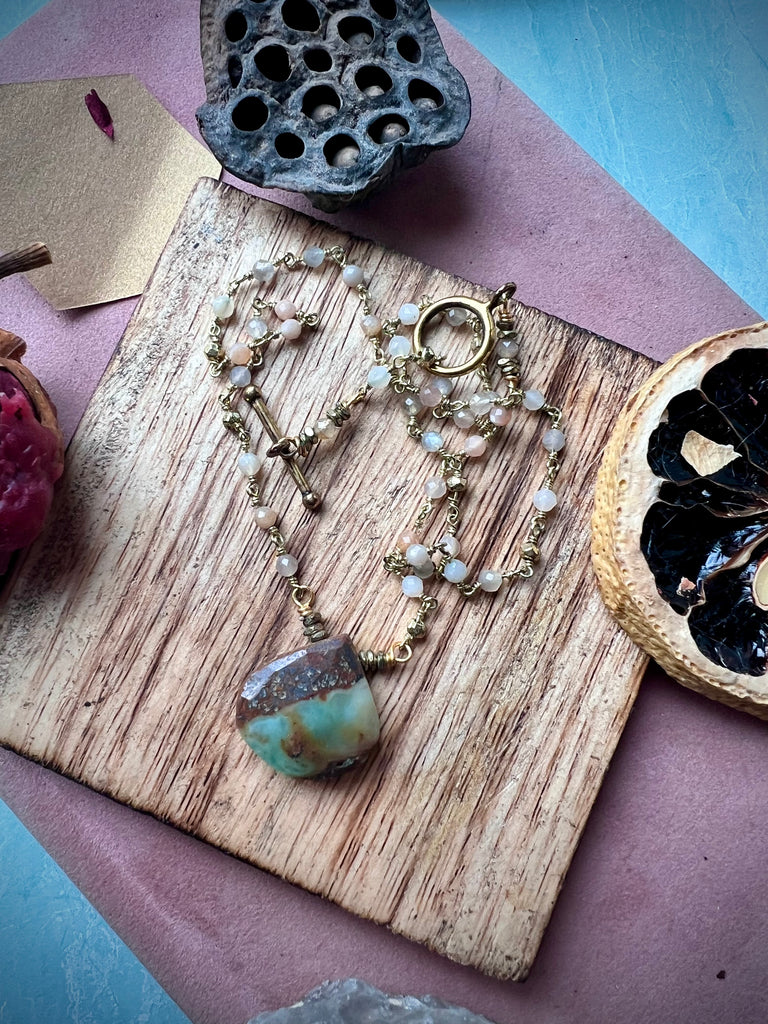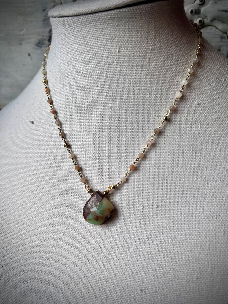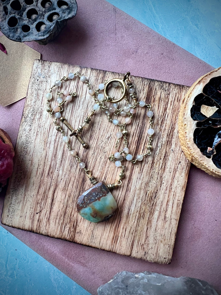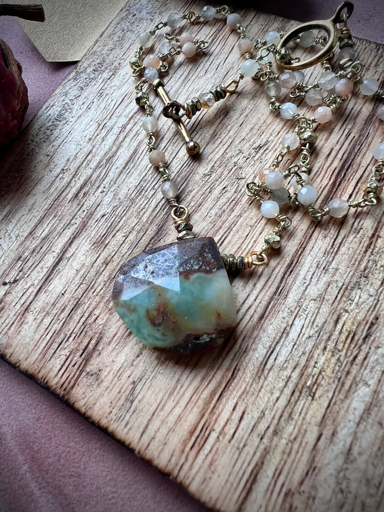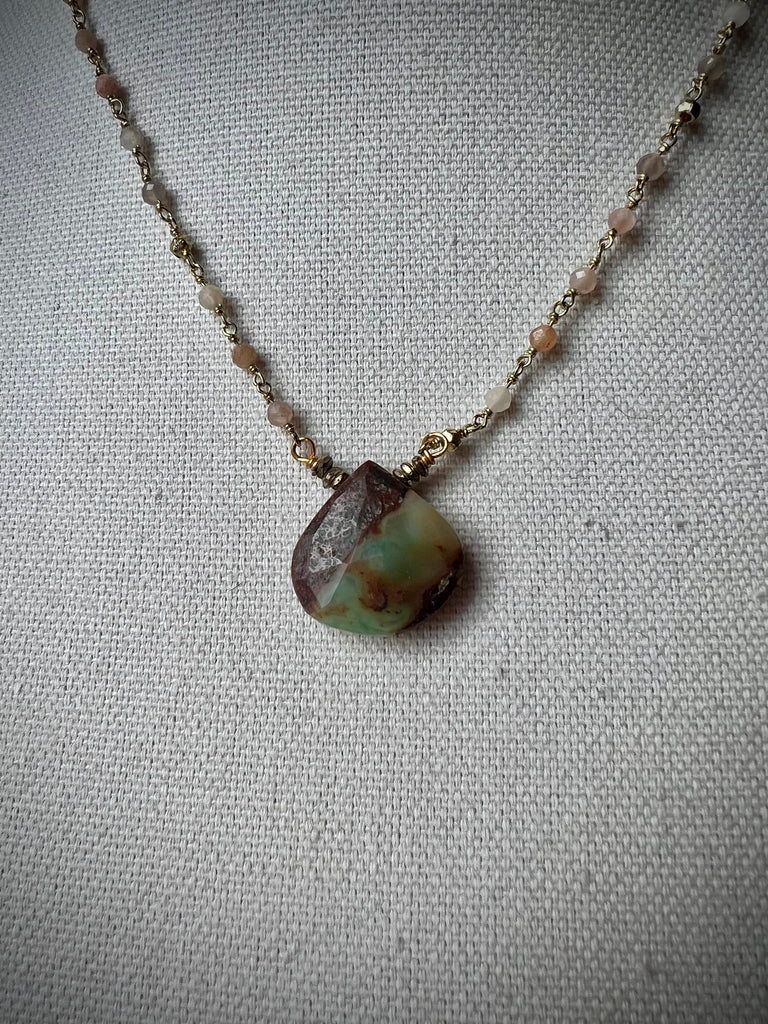 Beautiful Green Chalcedony Crystal on a Rose Quartz chain.