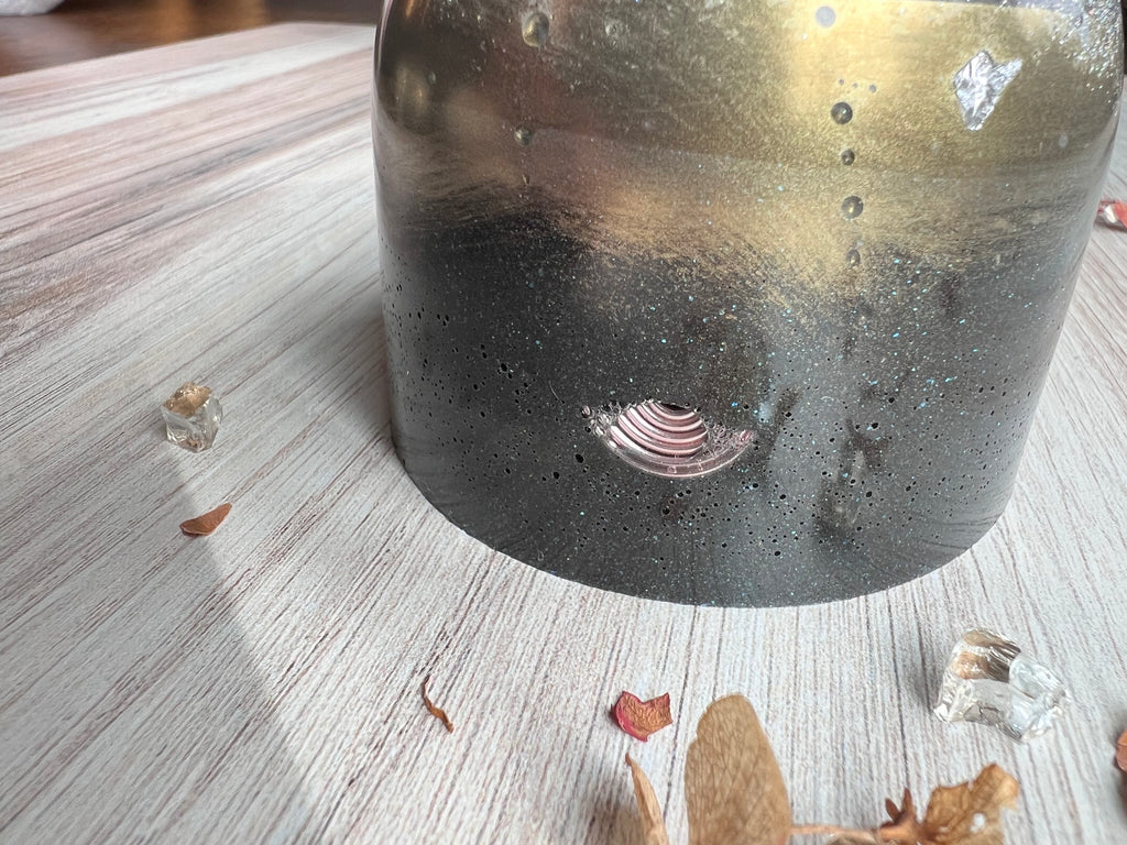 These are made with Resin, Copper shavings, Copper BBS, Copper coils, Rose Quartz, Shugnite powder, Selenite, & Amethyst.