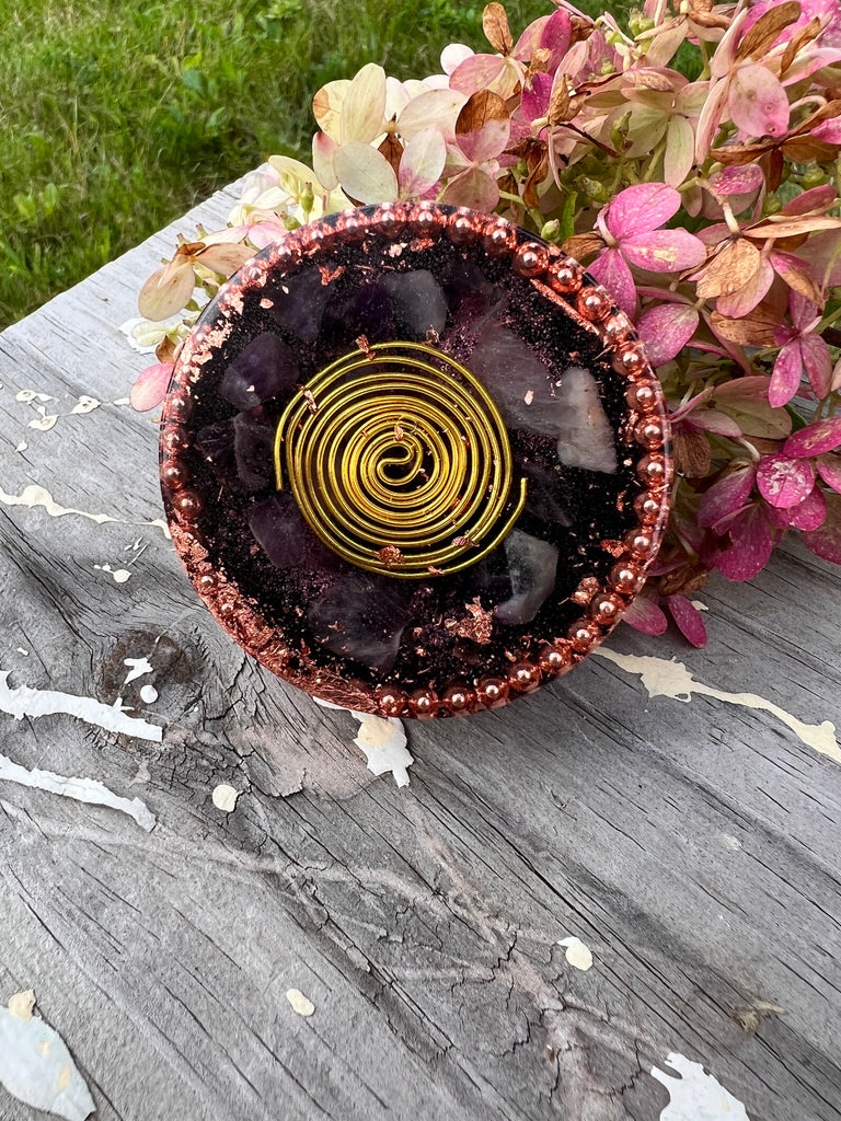 These are made with Resin, Copper shavings, Copper BBS, Copper coils, Rose Quartz, Shugnite powder, Selenite, & Amethyst.