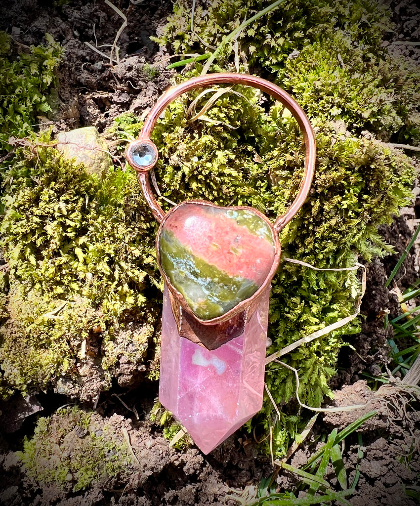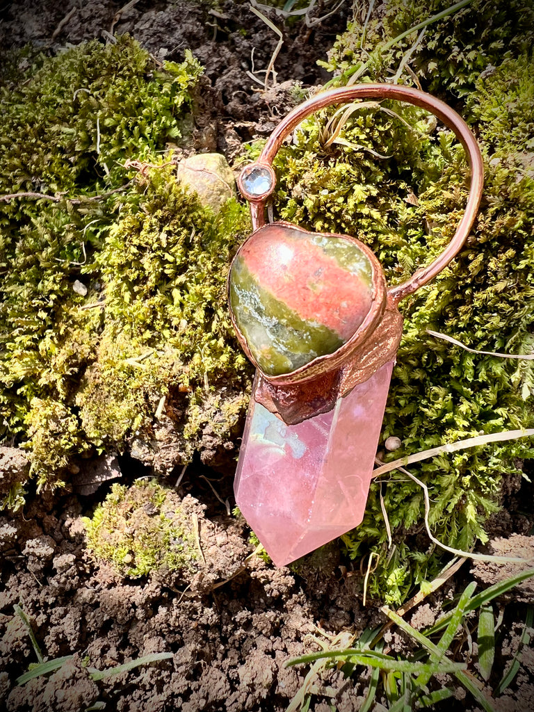 Electroformed Rose Quartz w/ Unakite on a Rose Gold Plated Copper Chain Necklace.