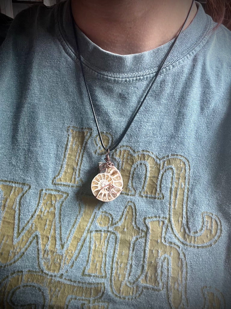 Wire wrapped Ammonite fossil with pure copper that was oxidized.